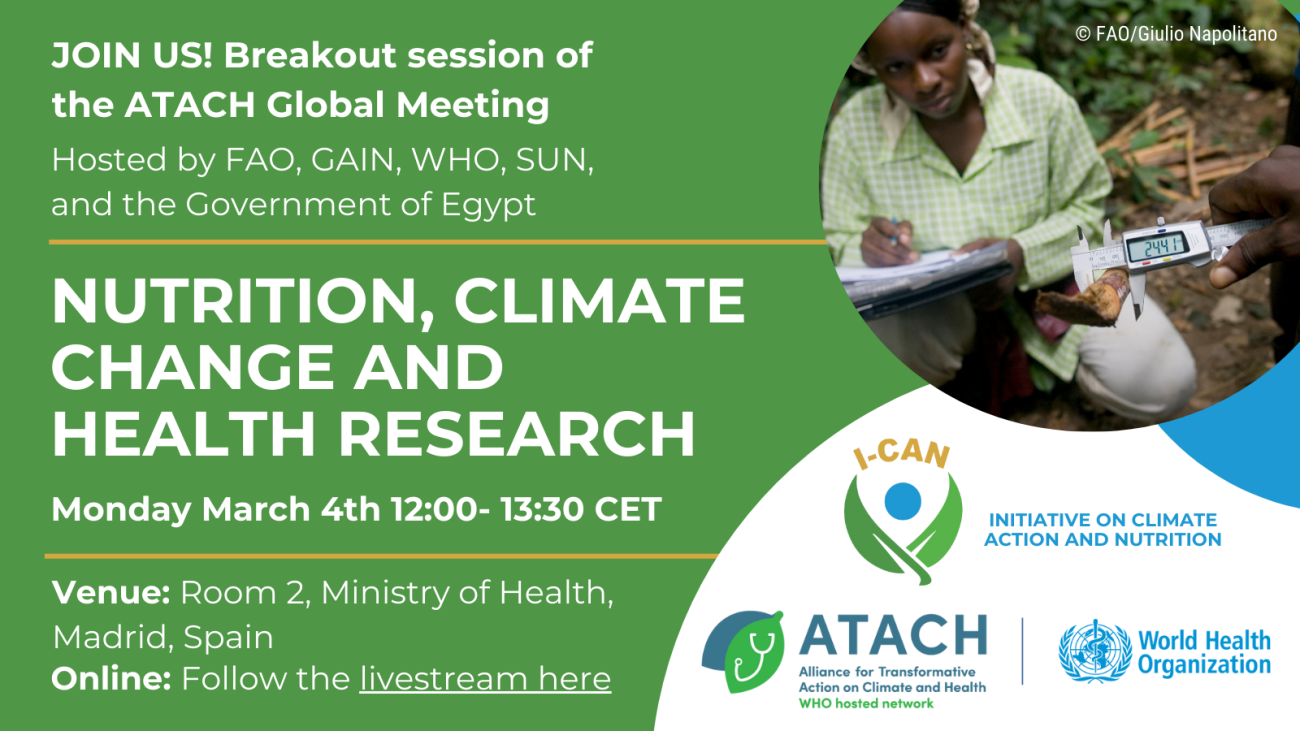 Co-hosted by Global Alliance for Improved Nutrition (GAIN) and World Health Organization (WHO), Food and Agriculture Organisation of the United Nations (FAO), Scaling Up Nutrition (SUN) Movement, this breakout session of the ATACH Global Meeting will introduce the Initiative on Climate Action and Nutrition (I-CAN) with a focus on nutrition, climate change and health research.